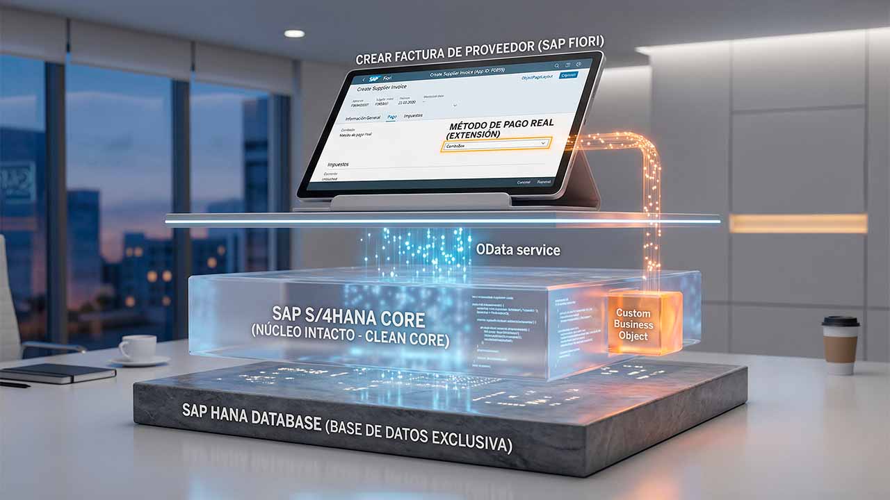 La estrategia Clean Core demostró ser el camino adecuado para cerrar esa brecha. En la capa de datos maestros, el Custom Business Object proporcionó una tabla configurable con su servicio OData generado automáticamente, sin escribir código ABAP. En la capa de campos, los Custom Fields extendieron la cabecera de la factura con dos campos adicionales que el servicio OData expone de forma nativa. En la capa de interfaz de usuario, el Extension Project inyectó la nueva sección con su lógica de auto-llenado, manteniendo la aplicación estándar intacta.