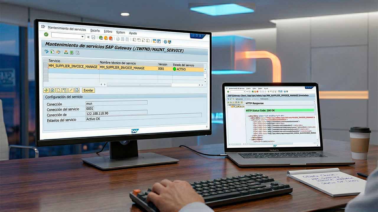 La transacción /IWFND/MAINT_SERVICE es el panel de administración de los servicios OData del SAP Gateway. Desde esta transacción se verifica que el servicio MM_SUPPLIER_INVOICE_MANAGE está registrado y activo en el front-end server.