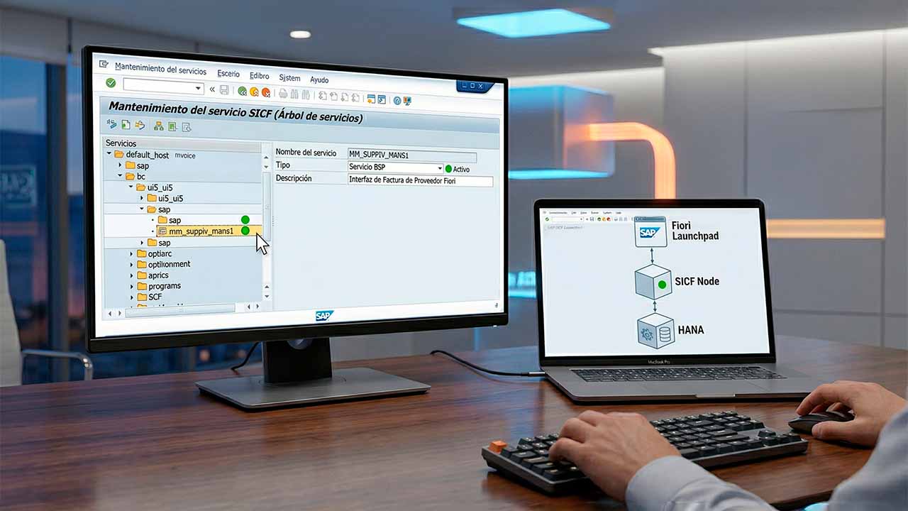 La transacción SICF (SAP Internet Communication Framework) gestiona los nodos de servicio HTTP del sistema. Cada aplicación SAPUI5 se despliega como un repositorio BSP que se sirve a través de un nodo ICF. Si el nodo no está activo, la aplicación no se carga en el navegador.