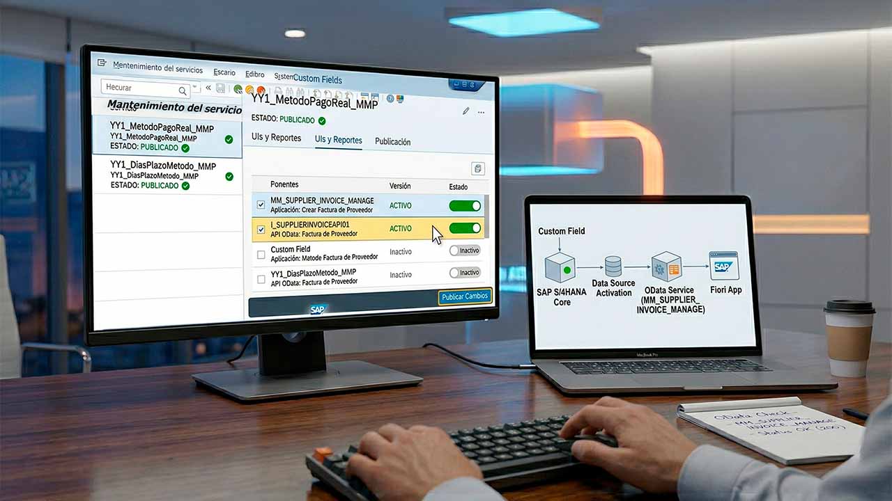 Este artículo presenta el desarrollo completo de una extensión para la aplicación Create Supplier Invoice en SAP S/4HANA 2020 On-Premise. El recorrido abarca tres capas: la creación de Custom Fields en la cabecera de la factura, la construcción de un Custom Business Object que almacena los métodos de pago con sus plazos por defecto, y el desarrollo de un Extension Project que inyecta un ComboBox conectado al objeto de negocio y actualiza los campos personalizados en tiempo real. El resultado final es una extensión funcional, transportable y upgrade-safe que no requiere una sola línea de código ABAP.