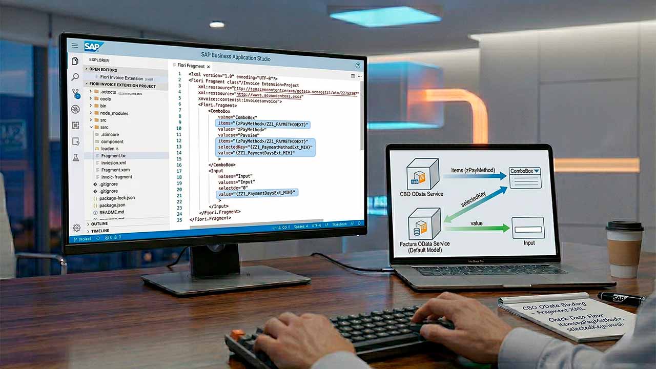 Al finalizar el recorrido descrito en este artículo, el resultado es una extensión completa de la aplicación Create Supplier Invoice que agrega una nueva pestaña con un ComboBox alimentado por un Custom Business Object y un campo de días de plazo que se auto-llena según la selección del usuario. La estructura del proyecto refleja la limpieza del enfoque: un controller extension (S1Custom.controller.js), un fragment XML (PaymentMethodFragment.fragment.xml), un archivo de internacionalización (i18n.properties), el componente heredado (Component.js) y el descriptor de la aplicación (manifest.json). Cinco archivos que extienden una aplicación estándar compleja sin modificar una sola línea de su código fuente.
