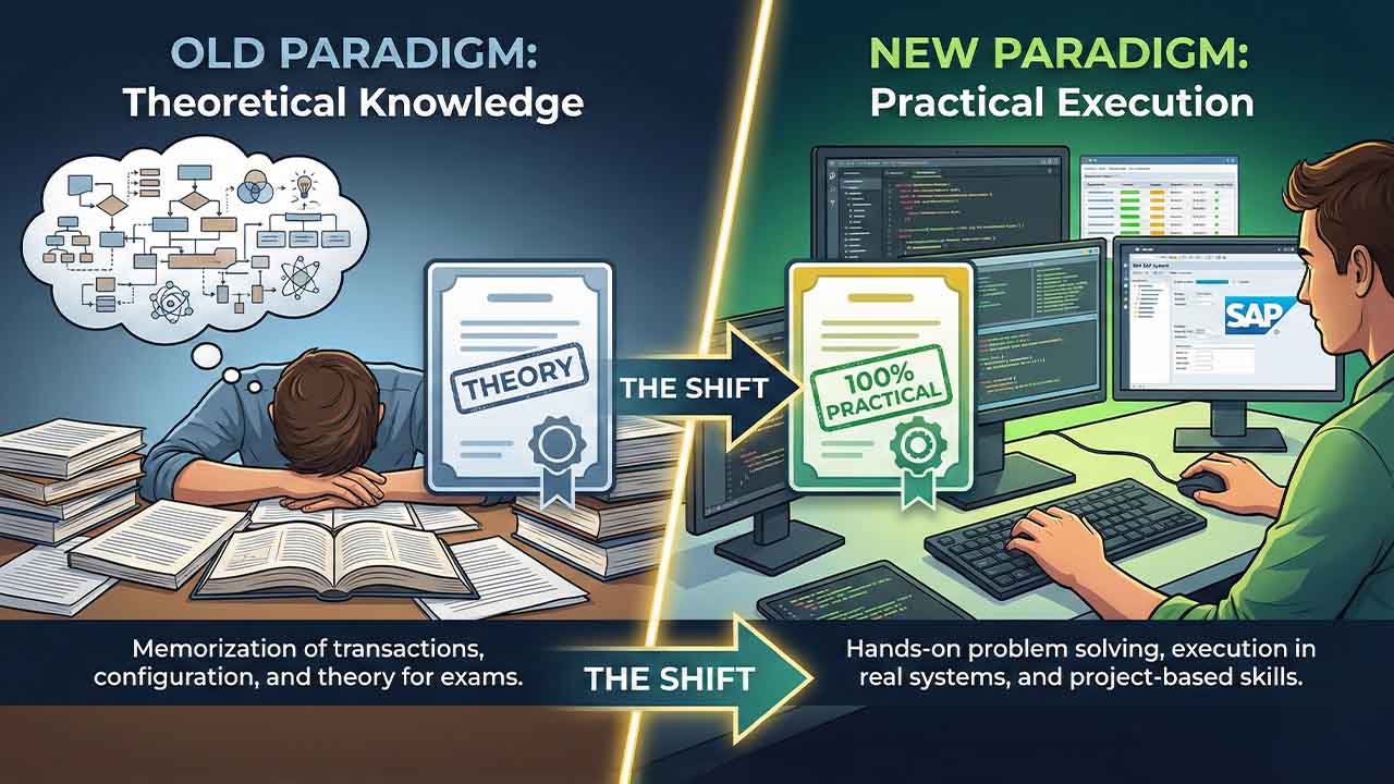 Durante años, demostrar conocimientos en SAP consistía en memorizar transacciones, rutas de configuración y conceptos teóricos para aprobar un examen estandarizado. Sin embargo, el mercado laboral actual exige profesionales que no solo conozcan la teoría, sino que sepan ejecutarla en sistemas reales. Para responder a esta necesidad, SAP ha introducido un nuevo modelo de certificación 100% práctico, cambiando por completo la estrategia de estudio y preparación.