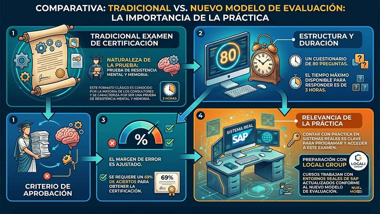 - Para programar y acceder a este examen, contar con práctica en sistemas reales es clave. Si quieres estar bien preparado, en nuestros cursos de Logali Group trabajamos con entornos reales de SAP, actualizados en este nuevo modelo de evaluación.