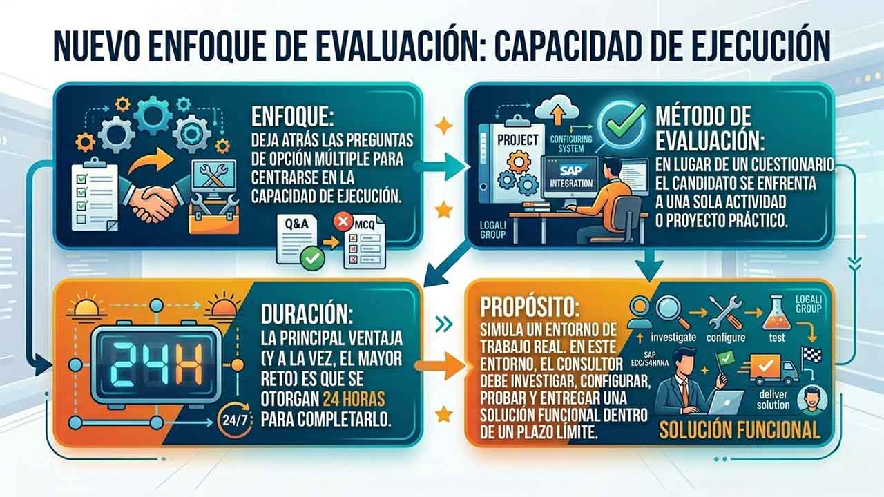 El nuevo enfoque deja atrás las preguntas de opción múltiple para centrarse en la capacidad de ejecución. En lugar de un cuestionario, el candidato se enfrenta a una sola actividad o proyecto práctico. La principal ventaja (y a la vez, el mayor reto) es que se otorgan 24 horas para completarlo. Esto simula un entorno de trabajo real donde el consultor debe investigar, configurar, probar y entregar una solución funcional dentro de un plazo límite.