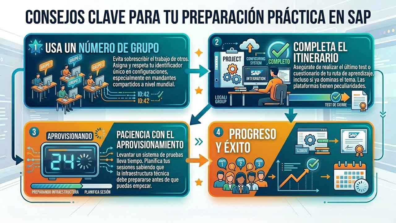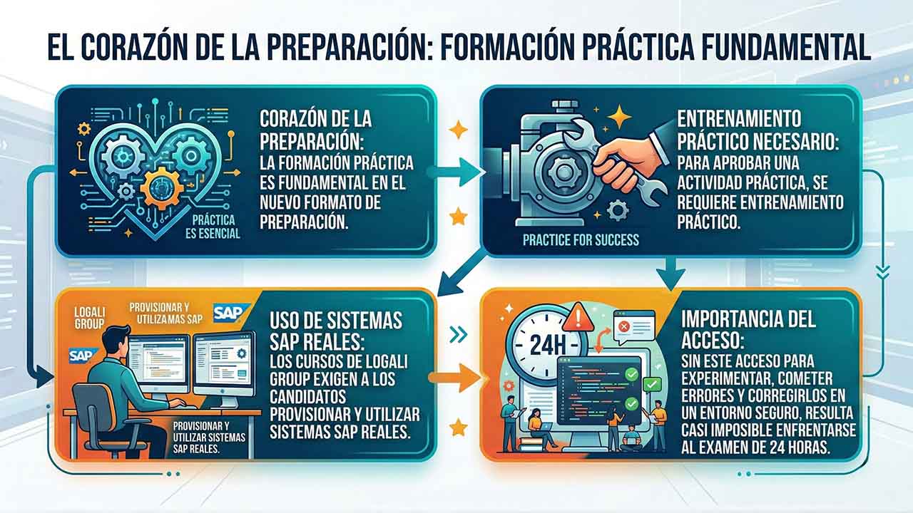 Aprobar una actividad práctica requiere entrenamiento práctico. A través de nuestros cursos de Logali Group, los candidatos deben realizar cursos que exigen “levantar” (provisionar) sistemas SAP reales. Sin este acceso para experimentar, equivocarse y corregir en un entorno seguro, enfrentarse al examen de 24 horas resulta casi imposible.