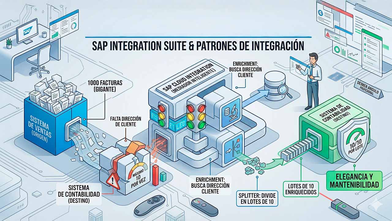 Conectar diferentes sistemas de software en una empresa puede parecerse a intentar dirigir el tráfico en una ciudad sin semáforos. Para evitar el caos, los expertos utilizan “Patrones de Integración”. En este artículo, desgranamos el reciente webinar práctico de Deimer Angulo (Logali Group) sobre SAP Integration Suite. Explicaremos en lenguaje sencillo qué son y cómo funcionan los cinco patrones clave (desde el Content Enricher hasta el Splitter), cómo mantener tus flujos bajo control y cómo la Inteligencia Artificial está a punto de transformar este mundo.