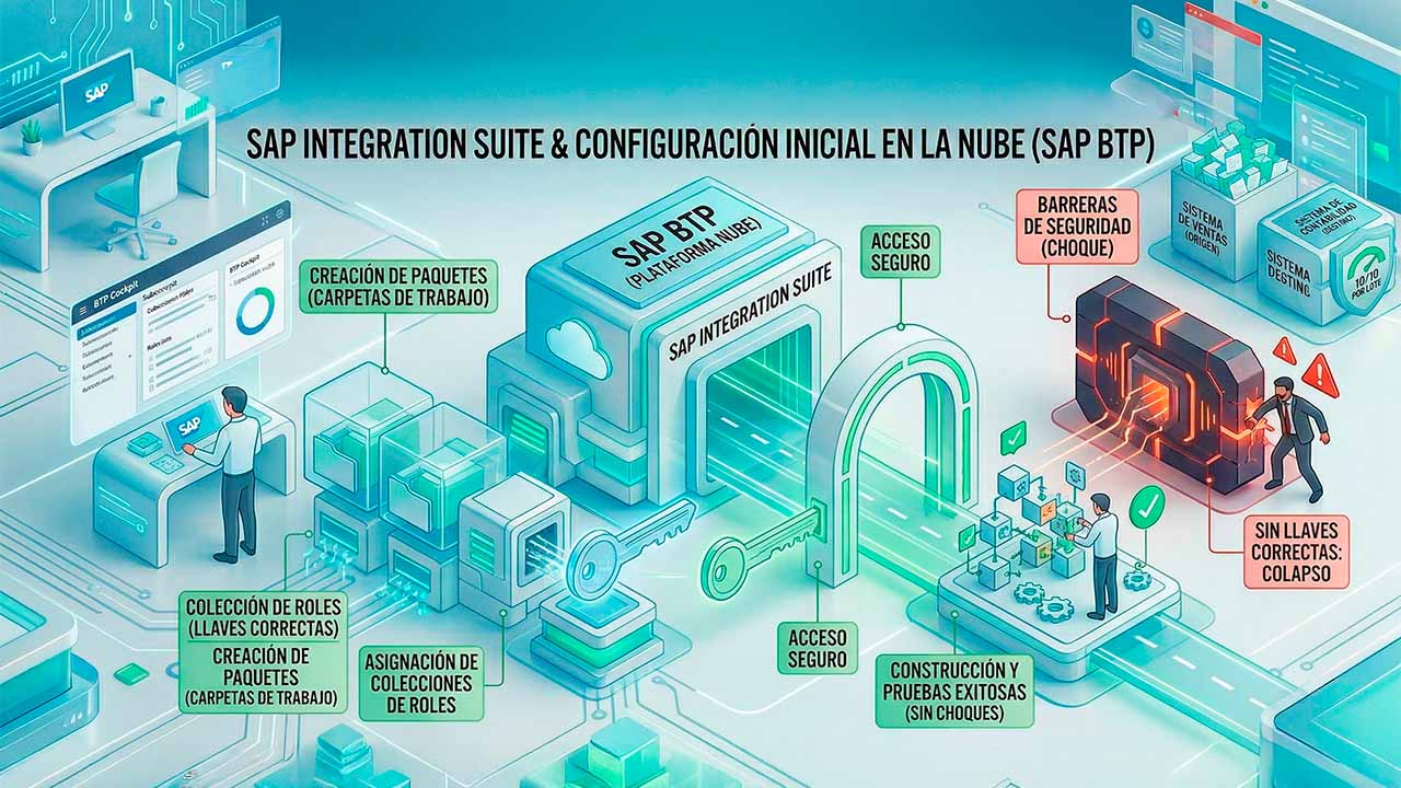 Esto implica crear los “paquetes” (las carpetas donde guardaremos nuestro trabajo) y asignar las “colecciones de roles”. En términos simples: es darle las llaves correctas al desarrollador para que pueda entrar al sistema, construir los flujos (iFlows) y probarlos sin chocar con las barreras de seguridad.