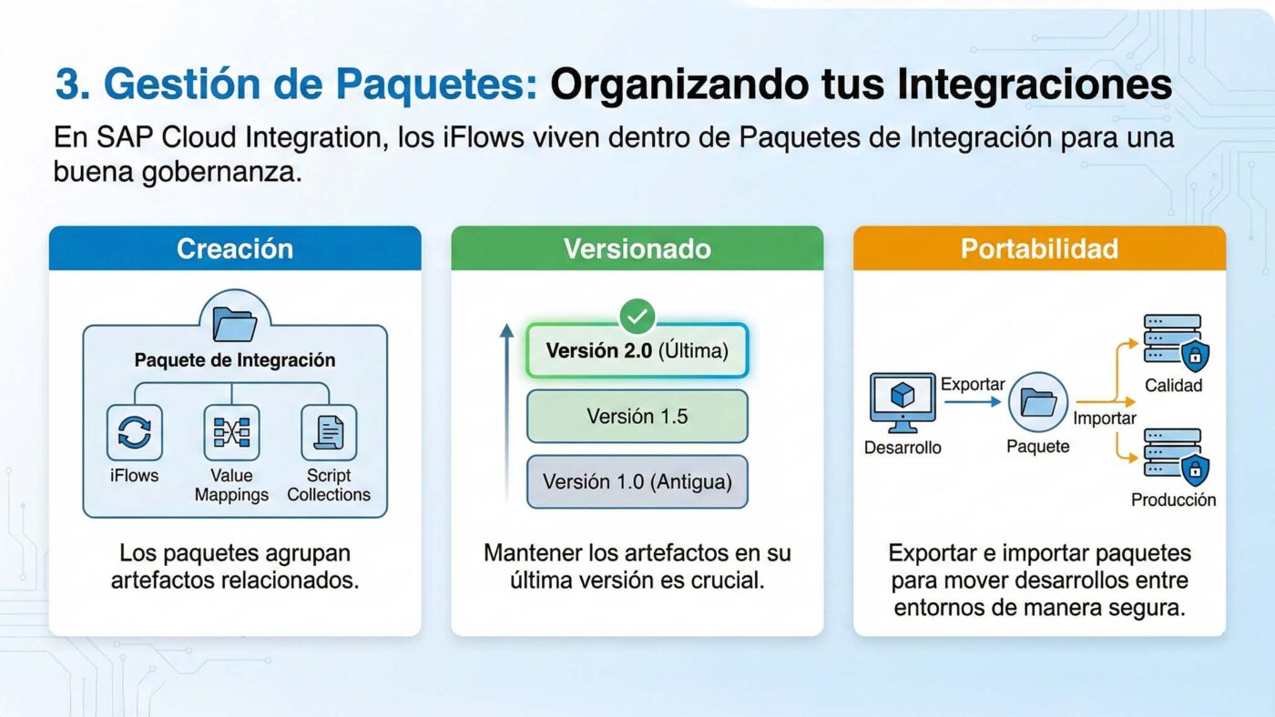 En SAP Cloud Integration, no creamos iFlows en el vacío; estos viven dentro de Paquetes de Integración. El seminario destaca la importancia de una buena gobernanza: