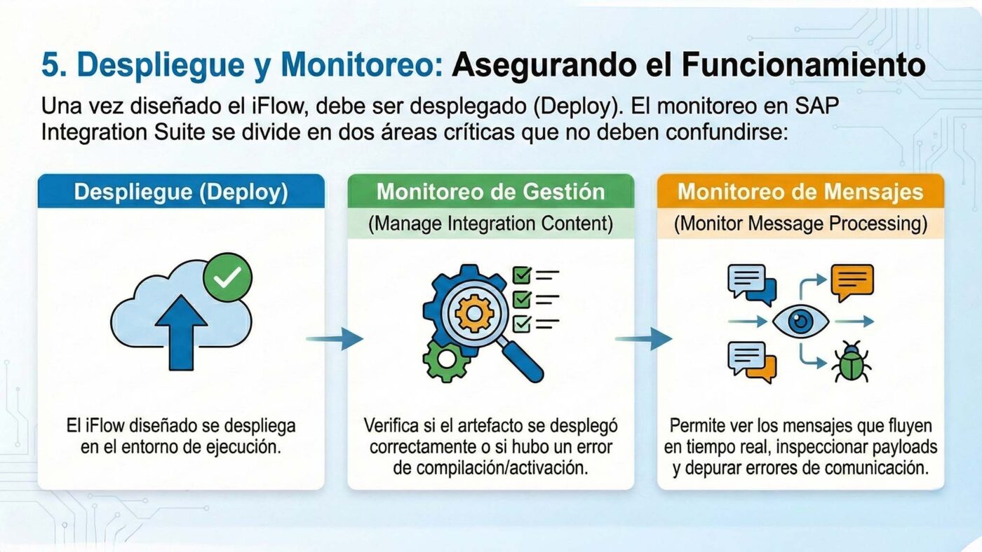 Una vez diseñado el iFlow, debe ser desplegado (Deploy). El monitoreo en SAP Integration Suite se divide en dos áreas críticas que no deben confundirse:
