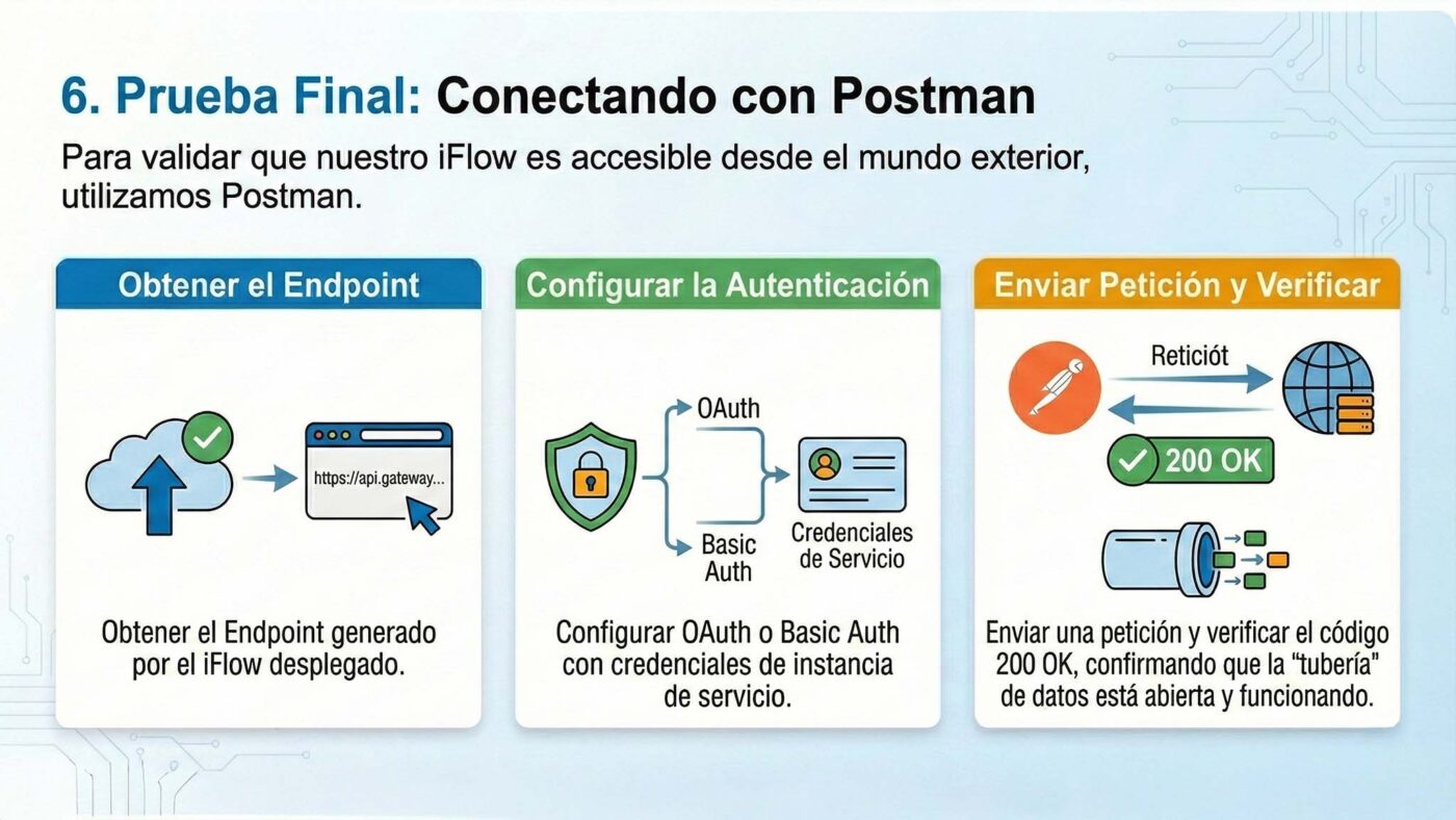Para validar que nuestro iFlow es accesible desde el mundo exterior, utilizamos Postman. El proceso requiere: